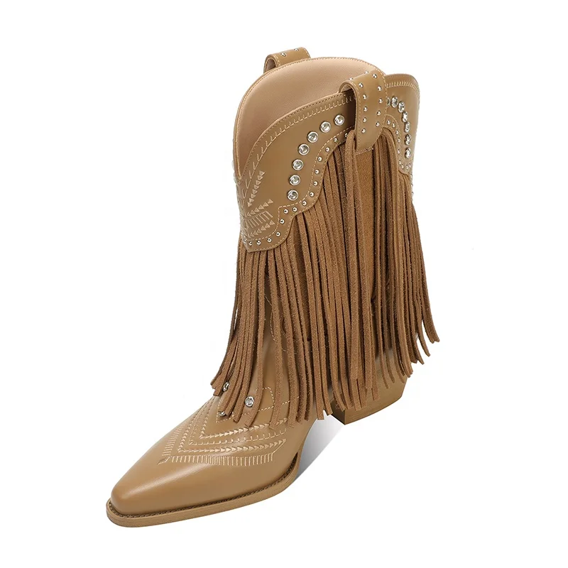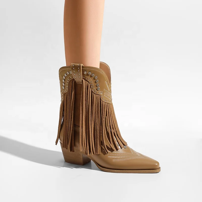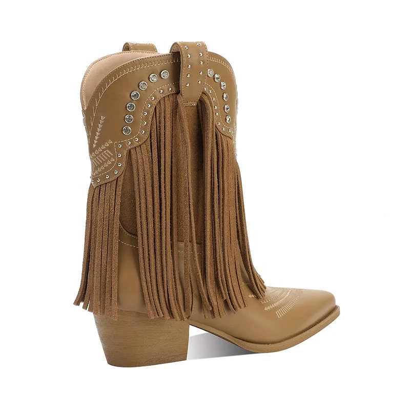 Western Cowgirl Fringe Boots with Embroidery Turquoise Pointed Toe Mid Heel Tassel Cowboy Boots for Women